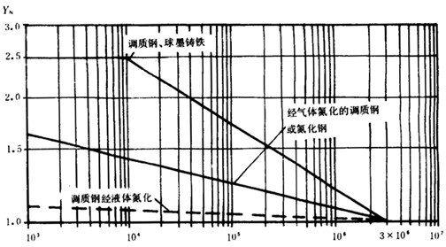 圖12當(dāng)調(diào)質(zhì)鋼和球墨鑄鐵的應(yīng)力循環(huán)次數(shù)NL或NV≥5×107時,ZN=1;氮化鋼的應(yīng)力循環(huán)次數(shù)NL或NV≥2×106時,ZN=1。圖13的應(yīng)力循環(huán)次數(shù)NL或NV≥3×106時,YN=1。