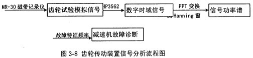 圖3-8是齒輪傳動(dòng)裝置信號(hào)分析流程圖,用HP3562動(dòng)態(tài)數(shù)字分析儀采集MR-30磁帶記錄儀紀(jì)錄的二級(jí)圓柱斜齒輪減速機(jī)試驗(yàn)過(guò)程中的模擬信號(hào),可得到齒輪傳動(dòng)裝置載荷、齒輪傳動(dòng)裝置箱體動(dòng)態(tài)激勵(lì)力應(yīng)變變化的時(shí)域信號(hào),對(duì)此信號(hào)作FFT變換,可得到載荷譜和動(dòng)態(tài)激勵(lì)力應(yīng)變變化時(shí)域信號(hào)的功率譜。為了防止功率譜泄露,在作FFT變換時(shí),需作加窗處理,由于試驗(yàn)采集的是隨機(jī)信號(hào),故加漢寧(Hanning)窗處理。利用故障診斷特征參數(shù)一傳動(dòng)零件可能發(fā)生故障的振動(dòng)頻率及其振動(dòng)頻率處的功率對(duì)試驗(yàn)信號(hào)進(jìn)行診斷分析。當(dāng)功率譜所包含的頻率成份難以區(qū)分時(shí),可采用倒譜分析。
