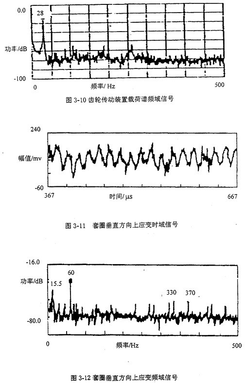 圖3-9和圖3-10分別是稱重傳感器測(cè)出的由磨擦加載裝置旋加給齒輪傳動(dòng)裝置載荷時(shí)域和頻域信號(hào)(功率譜)。從圖3-9和圖3-10可看出,載荷主要分量是頻率為28Hz正弦流。圖3-11和圖3-12分別是套圈垂直方向上應(yīng)變時(shí)域和頻域信號(hào)(功率譜)。
