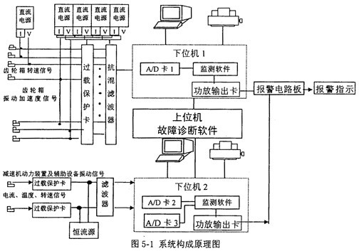 在設(shè)計以上硬件系統(tǒng)時充分考慮到工廠設(shè)備結(jié)構(gòu)復(fù)雜、現(xiàn)場干擾因素多、運轉(zhuǎn)條件惡劣、工藝狀況頻繁變動,如軋機不斷地處于咬鋼、軋鋼、拋鋼、空轉(zhuǎn)等狀態(tài)。為了保證硬件系統(tǒng)能長期可靠地在工廠工作,傳感器、信號處理儀、數(shù)據(jù)采集卡、計算機等重要關(guān)鍵硬件產(chǎn)品應(yīng)盡量選購國際上一流水平產(chǎn)品或國內(nèi)廠家生產(chǎn)經(jīng)受使用考驗的性能優(yōu)良的產(chǎn)品,參考國內(nèi)外在線監(jiān)測和故障診斷系統(tǒng)的硬件配置,并自行設(shè)計配制相應(yīng)附件,實施各項功能,并達到各項技術(shù)指標。根據(jù)現(xiàn)場調(diào)查和專家論證,齒輪減速機的監(jiān)測和故障診斷為某整個區(qū)域的核心和重點。圖5-1是硬件系統(tǒng)構(gòu)成原理圖。