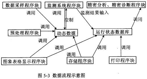 軟件的各個模塊通過動態(tài)數(shù)據(jù)和運行狀態(tài)數(shù)據(jù)庫聯(lián)系在一起,在下位機中,監(jiān)測系統(tǒng)控制著動態(tài)數(shù)據(jù)的采集、存儲、顯示和預(yù)處理,同時把監(jiān)測結(jié)果存入各機組運行狀態(tài)特征數(shù)據(jù)庫。在上位機中,詳細分析診斷程序塊調(diào)用運行狀態(tài)數(shù)據(jù)庫,得出診斷結(jié)果并調(diào)用打印程序塊輸出。圖5-3為數(shù)據(jù)流程示意圖,圖5-4為監(jiān)測系統(tǒng)流程示意圖。