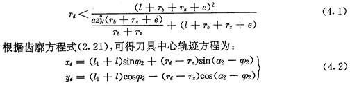 由上面可知,用數(shù)控加工齒廓時(shí),應(yīng)求出圓插刀中心的軌跡,它是被加工內(nèi)齒圈齒廓曲線的內(nèi)法向等距線,如圖4.3所示。圓插刀的半徑可不等于實(shí)際推桿減速器中滾子的半徑,只要刀具半徑Td小于內(nèi)齒圈齒廓在齒根部的最小曲率半徑,在加工過(guò)程中不會(huì)發(fā)生切削干涉即可。對(duì)于激波器為偏心圓的推桿減速器,根據(jù)(2. 35)式,可得不發(fā)生切削干涉的條件為: