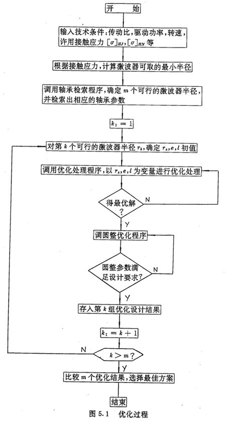 由于激波器一般使用通用軸承,所以激波器半徑Tb應(yīng)結(jié)合軸承標(biāo)準(zhǔn)來(lái)選擇。在程序中,先給各傳動(dòng)參數(shù)指定其取值范圍的中間數(shù)值,然后根據(jù)接觸應(yīng)力計(jì)算,確定滿足強(qiáng)度條件的最小激波器半徑,由軸承檢索程序,確定若干個(gè)可行的激波器半徑。在確定可行的激波器半徑時(shí),為了使減速器外徑尺寸不致過(guò)大,僅把與應(yīng)力計(jì)算結(jié)果相近的軸承半徑及其相鄰型號(hào)半徑作為可行的激波器半徑。對(duì)每一個(gè)可行的激器半徑Tb,調(diào)用優(yōu)化子程序以TZ,e,l為優(yōu)化變量進(jìn)行優(yōu)化處理。其算法流程如圖5.1所示。
