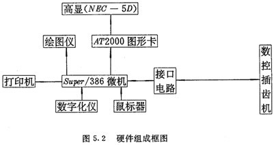 本系統(tǒng)是在一臺(tái)微型計(jì)算機(jī)super/386基礎(chǔ)上,增加一塊選進(jìn)的圖形卡,一臺(tái)高分辨率顯示器,數(shù)控接口電路及相應(yīng)設(shè)備,組成了一個(gè)微機(jī)工作站,如圖5.2所示。