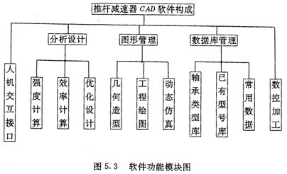 軟件主要由分析設(shè)計(jì)、圖形管理、數(shù)據(jù)庫(kù)管理及摟控加工四大部分組成,并提供了一個(gè)友好的人機(jī)交互接口界面用于實(shí)現(xiàn)漢字人機(jī)對(duì)話。本交互接口由三級(jí)推拉彈出式菜單組成。軟件模塊結(jié)構(gòu)如圖5.3所示。各大模塊的主要功能及特點(diǎn)如下: