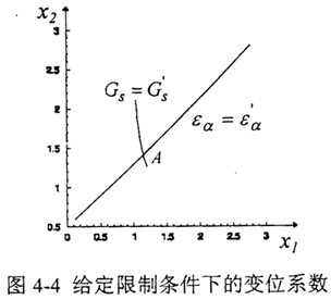 給定初值x1=1.0、x2=2.0,迭代過程及迭代結(jié)果如表4-2所示,給定限制條件下的變位系數(shù)選擇如圖4-4所示,交點(diǎn)A便對(duì)應(yīng)著這對(duì)齒輪的變位系數(shù)x11.14204,x2=1.40742。