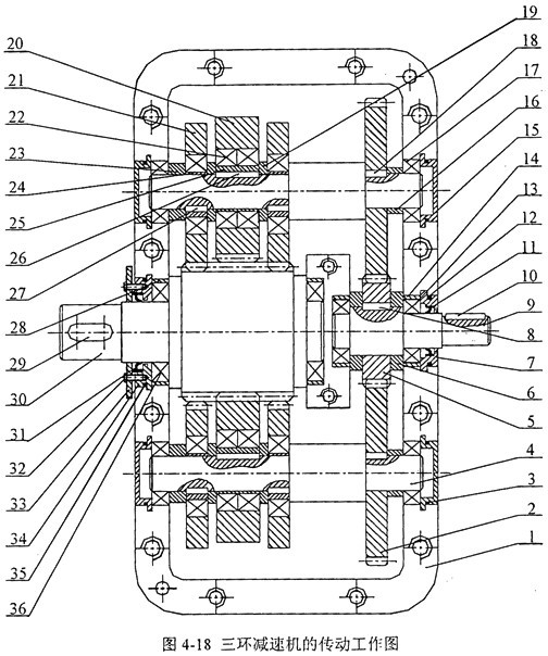 根據(jù)三環(huán)減速機(jī)的基本參數(shù)和結(jié)構(gòu)參數(shù),設(shè)計(jì)出三環(huán)減速機(jī)的傳動(dòng)工作圖如圖4-18所示。