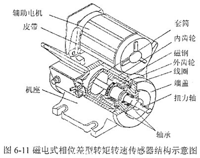 圖6-11為磁電式相位差型轉(zhuǎn)矩轉(zhuǎn)速傳感器的結(jié)構(gòu)示意圖,它由機(jī)座、端蓋、扭力軸、內(nèi)齒輪、外齒輪、磁鋼、線圈軸承等組成。內(nèi)齒輪、磁鋼固定在套筒上,線圈固定在端蓋上,外齒輪固定在扭力軸上,當(dāng)內(nèi)外齒輪發(fā)生相對(duì)轉(zhuǎn)動(dòng)時(shí),由于磁通不斷變化,在線圈中便感應(yīng)出近似正弦波的感應(yīng)電勢(shì)ul、u2,兩感應(yīng)電勢(shì)的初始相位差是恒定的,考慮到正反加載, 設(shè)計(jì)在大約180°位置上,當(dāng)加上扭力時(shí),扭力軸發(fā)生扭轉(zhuǎn)變形,在彈性范圍內(nèi)外加扭矩與機(jī)械扭轉(zhuǎn)角成正比,這時(shí)ul、u2訊號(hào)的相位差要發(fā)生變化,即