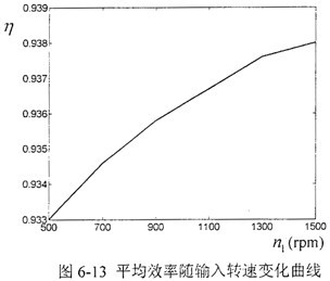 同樣方式測(cè)得當(dāng)輸入轉(zhuǎn)速分別為700rpm、900 rpm、1100 rpm、1300 rpm、1500 rpm時(shí),減速呂樣機(jī)的平均效率隨輸入轉(zhuǎn)速變化曲線如圖6-13。通過(guò)測(cè)試結(jié)果表明,在低中速情況下,減速器的傳動(dòng)效率受其轉(zhuǎn)速的影響不明顯,由于此時(shí)潤(rùn)滑脂溫度較低,隨著轉(zhuǎn)速的增加,減速器的傳動(dòng)效率略有提高,其平均值在93%以上,由引說(shuō)明本文設(shè)計(jì)的減速器具有較高的傳動(dòng)效率。