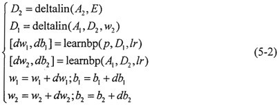 (3)計(jì)算各層反向傳播的誤差變化D1、D2,并計(jì)算各層權(quán)值的修正值及新的權(quán)值: