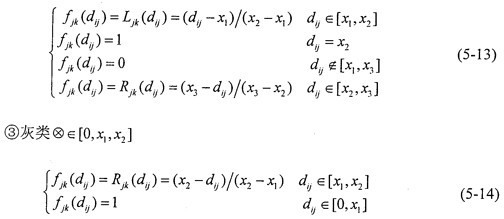 4.進(jìn)行灰色聚類 對(duì)象矩陣進(jìn)行聚類,聚類類別選為“1”、“2”、“3”三類時(shí),其白化權(quán)函數(shù)分別與式(5-12)~(5-14)和圖5-4對(duì)應(yīng)。
