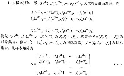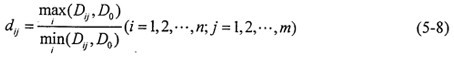 2.求轉(zhuǎn)換樣本矩陣 即象矩陣 由于指標(biāo)不同,要求不同,因此有必要按上限效果測(cè)度、下限效果測(cè)度、中心效果測(cè)度來(lái)統(tǒng)一樣本。當(dāng)指標(biāo)要求“越大越好”時(shí),可用上限效果測(cè)度,記統(tǒng)一后的樣本為dij,則有