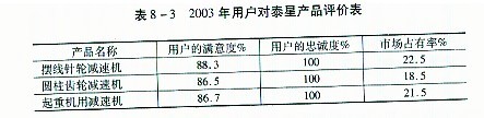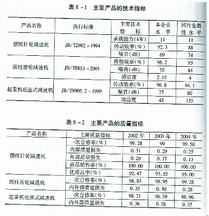 公司董事長張國林提出并率先在泰星減速機股份有限公司全面推行的以“三改、三制、三化”為主線的一系列的管理理念、管理模式、管理方法、運行機制和創(chuàng)新機制,不僅對公司的內(nèi)部管理產(chǎn)生了巨大的成效,取得了很好的企業(yè)效益,且得到了社會的廣泛認可,產(chǎn)生了很好的社會效應(yīng)和一定的理論效應(yīng)。 I 推動企業(yè)發(fā)展 創(chuàng)造了超一流的產(chǎn)品 泰星減速機股份有限公司正是認真貫徹了公司董事長張國林的“一保產(chǎn)品質(zhì)量,二保供貨期”的質(zhì)量思想,在企業(yè)員工中形成了一種“用戶在我心中、質(zhì)量在我手中、用戶的需求就是我們的追求、用戶滿意才有我們的滿意”的質(zhì)量共識,為用戶提供了國內(nèi)領(lǐng)先、國際一流的高質(zhì)量的產(chǎn)品。 泰星產(chǎn)品的高質(zhì)量體現(xiàn)在:代表主要產(chǎn)品質(zhì)量水平的主要技術(shù)指標遠遠超過了同行業(yè)的最佳水平。見表8—1。 主要產(chǎn)品的質(zhì)量指標遠遠超過了國內(nèi)的最好水平。主要產(chǎn)品的質(zhì)量水平見表8—2。 到2004年泰星減速機股份有限公司的產(chǎn)品合格率連續(xù)11年達到100%,一等品率2004年達到95.3%,優(yōu)等品率達到72.50%。 泰星公司生產(chǎn)的產(chǎn)品噪音低,無污染,環(huán)境指標達到了國內(nèi)的同行業(yè)的領(lǐng)先水平。  增強了研發(fā)能力 公司董事長張國林認識到:“技術(shù)創(chuàng)新是企業(yè)發(fā)展的關(guān)鍵。沒有先進的技術(shù),先進的設(shè)備和工藝,就不可能生產(chǎn)出質(zhì)量過硬的產(chǎn)品,企業(yè)也無法立足于市場,擴大規(guī)模,企業(yè)發(fā)展也就成為一句空話”。因此,董事長張國林非常重視企業(yè)科技開發(fā)工作,一方面,不斷加大公司的科技研發(fā)費用的投人,早在2000年泰星減速機股份有限公司的研究與開發(fā)費用已經(jīng)占到公司當(dāng)年銷售收入的9.7%,遠遠超過了國內(nèi)同行業(yè)企業(yè)的先進水平,已經(jīng)接近國外大型跨國公司10%的最好水平,泰星股份公司的研究與開發(fā)費用還在以每年20%的速度在增長;另一方面,為了提高企業(yè)的技術(shù)研發(fā)能力,泰星股份公司于1998年初就成立了減速機研究所,研究所取得了豐碩的科研成果,他們自主設(shè)計、自主研制、自主開發(fā)的9000系列擺線釷輪減速機、9000系列硬齒面減速機、9000系列中硬齒面減速機達到了國際21世紀先進水平。 營造了整潔的工作環(huán)境 泰星股份公司董事長張國林認為:一方面,優(yōu)美的廠區(qū)環(huán)境,是企業(yè)領(lǐng)導(dǎo)層富有戰(zhàn)略眼光的重要反映,也是企業(yè)形象和職工精神面貌的綜合體現(xiàn)。它有利于避免因外部環(huán)境干擾而引起的不良心理和生理現(xiàn)象,激發(fā)職工的勞動熱情,提高勞動生產(chǎn)率;另一方面,公司的員工每天要在公司工作八個小時,公司、工廠、車間的環(huán)境美化了,能為員工營造一個舒適的工作環(huán)境,保證員工心情愉快,使員工處在一種愉悅的工作狀態(tài)中,這樣也有利于產(chǎn)品質(zhì)量的提高。因此,按照定制工藝的要求,本著使人機物處于最佳優(yōu)化組合狀態(tài)的原則,對公司的各個部門,車間內(nèi)部進行了合理的平面布置,并重點抓了“兩通”“三化”工程建設(shè),不僅保證了車間內(nèi)的工作環(huán)境清潔、整齊,且使整個廠區(qū)布局合理、美麗、整潔。難怪國外的 同行來星股份公司考察時,發(fā)出了這樣的贊嘆:“簡直就是一座花園式的工廠”。 形成了愛廠如家的工作熱情 沒有工作制度,沒有任何約束,員工自愿一天為企業(yè)工作14個小時。這種工作熱情在目前的市場經(jīng)濟社會中是罕見的。泰星公司員工的這種工作熱情來源于張國林董事長提出的“能上能下,競爭上崗:實績計酬”,“生活溫暖化”等一系列管理理念、管理方法在太星中的推行張董事長的這些管理理念與管理方法的實施,在企業(yè)內(nèi)部為員工們創(chuàng)造了一種發(fā)揮自己的才能,發(fā)揮自已的水平:一切憑實績講話,~切憑數(shù)據(jù)講話的氛圍。讓員工們也感受到了為企業(yè)工作的甜頭,感受到了他們的切身利益是與企業(yè)的榮辱:興衰密不可分的。因此,員工們愿意也樂意為企業(yè)工作。 創(chuàng)造了領(lǐng)先同行業(yè)十年的輝煌業(yè)績 由于董事長張國林治企有方,使泰星公司得到了快速的發(fā)展。在1993年,衡量公司經(jīng)濟效益的主要指標:資金利潤率、銷售利潤率、成本費用利潤率、總資產(chǎn)貢獻率、流動資金周轉(zhuǎn)率、全員勞動生產(chǎn)率:產(chǎn)品銷售率、質(zhì)量損失率、新產(chǎn)品產(chǎn)值率以及萬元總產(chǎn)值綜合能耗均保持在全國同行業(yè)的領(lǐng)先水平。 在2003年泰星股份公司的主要經(jīng)濟效益指標分別為:總資產(chǎn)零獻率為29.25%,資本保值增值率127.83%,資金周轉(zhuǎn)率2.64次,成本費用利潤17.33%,全員勞動產(chǎn)生產(chǎn)率22.36萬元/人,產(chǎn)銷率100.30,產(chǎn)品質(zhì)量等級品率120.72%,質(zhì)量損失率為0.38,新產(chǎn)品產(chǎn)值率25.08,萬元總產(chǎn)值綜合能耗為0.158噸/萬元。 贏得了客戶的信賴 目前,泰星減速機股份有限公司的用戶已經(jīng)遍布全國各地,正在擴展到世界各地。國內(nèi)許多大的