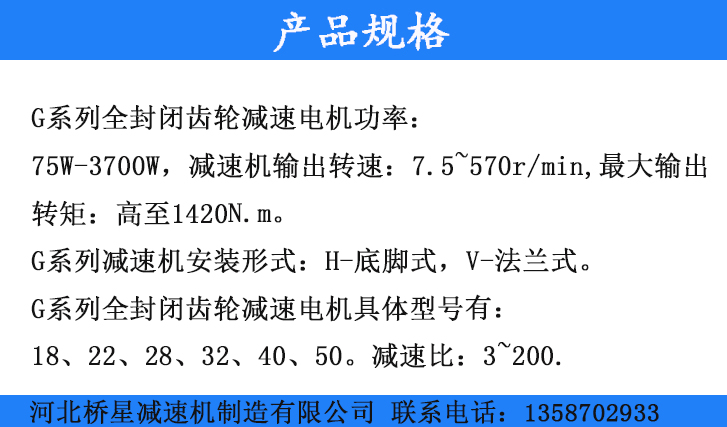 G系列全封閉齒輪減速電機(jī)功率、:75W-3700w,減速機(jī)輸出轉(zhuǎn)速、:7.5-570rmin,最大輸出轉(zhuǎn)矩:高至1420Nm,G系列減速機(jī)安裝形式:H-底腳式V法蘭式。G系列全封閉齒輪減速電機(jī)具體型號(hào)有:18、22、28、32、40、50減速比:3~200