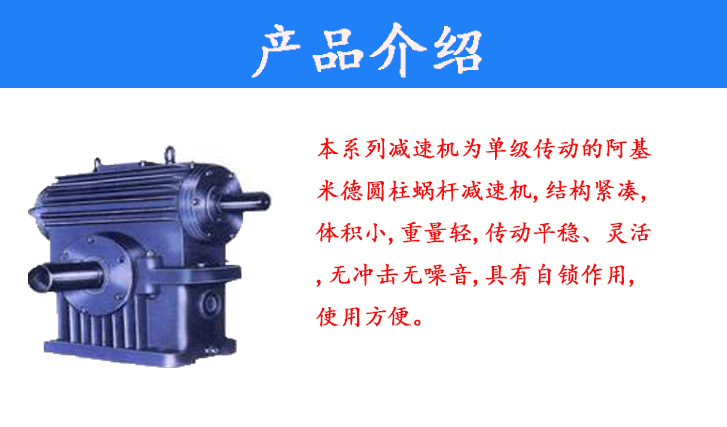 本系列減速機(jī)為單級(jí)傳動(dòng)的阿基米德圓柱蝸桿減速機(jī),結(jié)構(gòu)緊湊,體積小,重量輕,傳動(dòng)平穩(wěn)、靈活,無沖擊無噪音,具有自鎖作用,使用方便。適用于化工、冶金、礦山、紡織、食品、醫(yī)藥等行業(yè)的各種機(jī)械設(shè)備上。