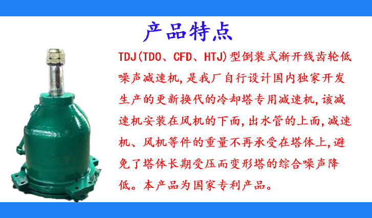 TDJ(TDO、CFD、HTJ)型倒裝式漸開(kāi)線齒輪低噪聲減速機(jī),是我廠自行設(shè)計(jì)國(guó)內(nèi)獨(dú)家開(kāi)發(fā)生產(chǎn)的更新?lián)Q代的冷卻塔專(zhuān)用減速機(jī),該減速機(jī)安裝在風(fēng)機(jī)的下面,出水管的上面,減速機(jī)、風(fēng)機(jī)等件的重量不再承受在塔體上,避免了塔體長(zhǎng)期受壓而變形塔的綜合噪聲降低。本產(chǎn)品為國(guó)家專(zhuān)利產(chǎn)品。