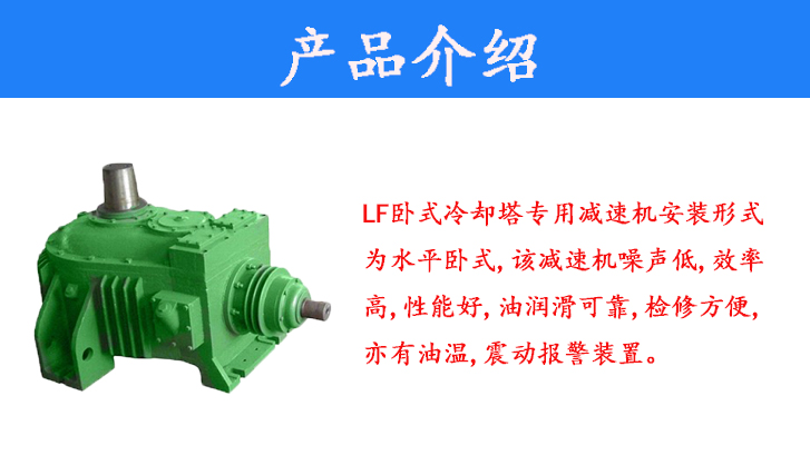 LF臥式冷卻塔專用減速機(jī)安裝形式為水平臥式,該減速機(jī)噪聲低,效率高,性能好,油潤(rùn)滑可靠,檢修方便,亦有油溫,震動(dòng)報(bào)警裝置。