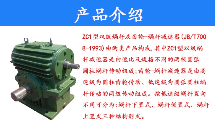 ZC1型雙級(jí)蝸桿及齒輪-蝸桿減速器(JB/T7008-1993)由兩類(lèi)產(chǎn)品構(gòu)成,其中ZC1型雙級(jí)蝸桿減速器是由速比及規(guī)格不同的兩極圓弧圓柱蝸桿傳動(dòng)組成;齒輪-蝸桿減速器是由高速級(jí)為圓柱齒輪傳動(dòng)、低速級(jí)為圓弧圓柱蝸桿傳動(dòng)的兩級(jí)傳動(dòng)組成。