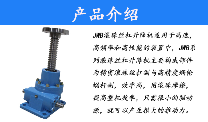 JWB滾珠絲杠升降機適用于高速、高頻率和高性能的裝置中,JWB系列滾珠絲杠升降機主要構成部件為精密滾珠絲杠副與高精度度蝸輪蝸桿副,效率高,用滾珠摩擦,提高整機效率,只需很小的驅動源,就可以產生很大的推動力。