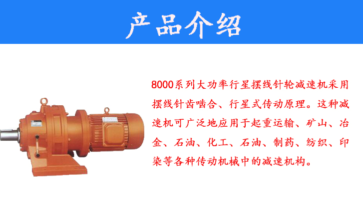 8000系列大功率行星擺線針輪減速機采用擺線針齒嚙合、行星式傳動原理。這種減速機可廣泛地應用于起重運輸、礦山、冶金、石油、化工、石油、制藥、紡織、印染等各種傳動機械中的減速機構。