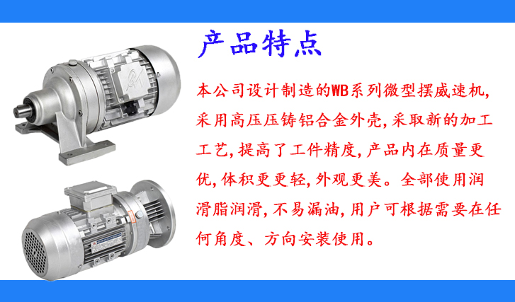前言40-300N0-17微型擺威速機(jī),采用高壓壓鑄鋁合金外殼,采取新的加工工藝,提高了工件精度,產(chǎn)品內(nèi)在質(zhì)量更優(yōu),體積更更輕,外觀更美。全部使用潤(rùn)滑脂潤(rùn)滑,不易漏油,用戶可根據(jù)需要在任何角度、方向安裝使用。機(jī)型號(hào)及型號(hào)表示方法單級(jí)減速機(jī)型號(hào)有WB65、WB85、WB100、WB120、WB150