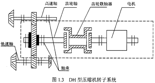 本課題來源于某工程應(yīng)用研究“雙軸型透平壓縮機軸承轉(zhuǎn)子系統(tǒng)動力學(xué)分析”。圖1.3 是DH 型壓縮機轉(zhuǎn)子系統(tǒng)。在G 軸與電機軸之間采用齒輪聯(lián)軸器聯(lián)接。本文主要對圖1.3 虛線部分,G 軸、電機軸、齒輪聯(lián)軸器轉(zhuǎn)子系統(tǒng)進行討論