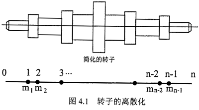 一個實際轉(zhuǎn)子,可以看作由一根變截面的軸和分布其上的若干圓盤所組成。用集總質(zhì)量法,可將其離散成n段無質(zhì)量的彈性軸和n-1個集總質(zhì)量。如圖4.1所示。具體過程見文獻(xiàn)。