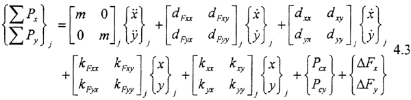 式4.3中右端第一項為慣性力:三、五兩項為滑動軸承的油膜力;二、四兩項為外加阻尼力及剛度力……,Pcx,Pcy則代表與系統(tǒng)本征值無關(guān)的外加激勵力、不平衡力、重力或其它控制力。ΔFx,ΔFy為齒輪動態(tài)嚙合力在x、y方向上的分量。當(dāng)所簡化的質(zhì)點是各向同性時,其直徑轉(zhuǎn)動慣量θx=θy=Jd,極轉(zhuǎn)動慣量θz=Jp。