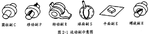 在等角速萬向聯(lián)軸器中,大部分都屬于連桿機(jī)構(gòu).最古老的雙聯(lián)十字軸萬向聯(lián)軸器機(jī)構(gòu)就是球面四連桿機(jī)構(gòu)。從大量的不同的機(jī)構(gòu)綜合中,有可能得出多種實用的等角速連桿機(jī)構(gòu),所以研究等角速理論,以連桿機(jī)構(gòu)的型式和尺度關(guān)系為對象,進(jìn)行新的等角速理論的探索,在一定的意義上是可行的。在機(jī)構(gòu)學(xué)上,構(gòu)件同構(gòu)件間的連接稱為副,其不同的形式和代號如圖2-1所示: