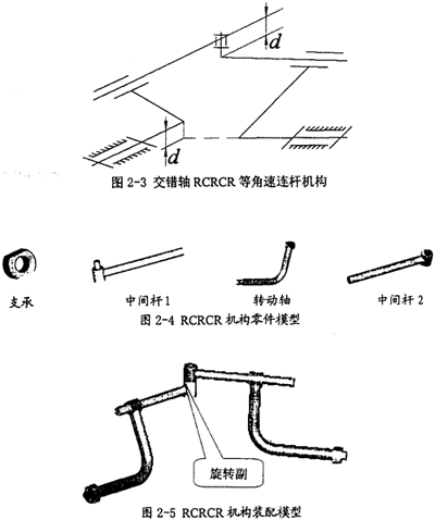 通過上述的方法,可以得到相交軸、交錯軸形式的多種等角速連桿機(jī)構(gòu)。在圖2-2中列出了其中的一部分,它們都是相交軸傳動的形式,當(dāng)然全都是鏡面機(jī)構(gòu)。在這些機(jī)構(gòu)中有的已被應(yīng)用在等角速聯(lián)軸器上,如球鉸柱塞式萬向聯(lián)軸器就是以RPSPR機(jī)構(gòu)為基礎(chǔ)。在圖2-3中列出了其中的一種較重要的交錯軸形式的等角速連桿機(jī)構(gòu)。
