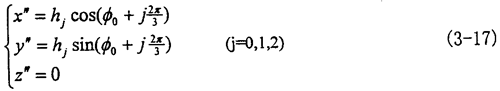 由式(3-14)則有小桿在滑道中的滑動位移即為坐標(biāo)z′值,由于三小桿的滑動位移是相同的,可取其中之一進(jìn)行表示,令h1為其位移量則可表示為: