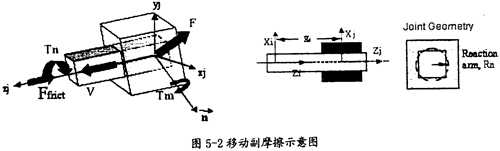 移動副產(chǎn)生摩擦的示意圖如圖5-2所示。在這種運(yùn)動副中只會產(chǎn)生逆向于移動方向v(如圖5-2中藍(lán)色箭頭所示)的摩擦力Ffrict(如圖5-2中紅色箭頭所示),它的產(chǎn)生主要由三種因素,即構(gòu)件間相互作用的徑向力F、構(gòu)件間相互作用的扭矩Tn、構(gòu)件間相互作用的彎矩Tm(這三種力如圖5-2中綠色箭頭所示)。在施加由這些作用力產(chǎn)生的摩擦力時,要考慮徑向力F的大小、等效作用臂長Rn(如圖5-2中右邊圖所示運(yùn)動副間的重疊量和重疊量的變化情況、扭矩Tn的大小和它的等效反作用臂長Rn、彎矩Tm的大小和彎矩的反作用臂長XS(如圖5-2中間圖所示)。另外還得考慮靜摩擦系數(shù)、動摩擦系數(shù)及預(yù)載荷的作用。