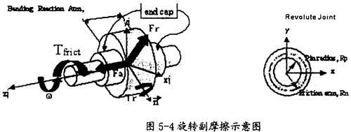 旋轉(zhuǎn)副產(chǎn)生摩擦的示意圖如圖5-4所示。在這種運(yùn)動副中只會產(chǎn)生逆向于旋轉(zhuǎn)方向ω(如圖5-4中藍(lán)色箭頭所示)的摩擦扭矩Tfrict(如圖5-4中紅色箭頭所示),它的產(chǎn)生主要由三種因素,即構(gòu)件間相互作用的徑向力Fr、構(gòu)件間相互作用的軸向力Fa、構(gòu)件間相互作用的彎矩Tr(這三種力如圖5-4中綠色箭頭所示)。在施加由這些作用力產(chǎn)生的摩擦力時,要考慮徑向力Fr的大小、圓柱半徑RP(如圖5-4右圖所示)、軸向力Fα的大小、摩擦半徑Rn的大。ㄈ鐖D5-4右圖所示)、彎矩Tm的大小和彎矩的反作用臂長(即旋轉(zhuǎn)副的長度,如圖5-4中左圖所示),另外還得考慮靜摩擦系、動摩擦系數(shù)及預(yù)載荷的作用。