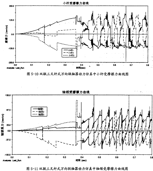 由圖5-10可以看出,雙聯(lián)三叉桿式萬向聯(lián)軸器在動力仿真的過程中,其一端的三小桿同滑桿套軸間的摩擦力變化相當(dāng)有規(guī)律。當(dāng)小桿相對滑桿套軸運(yùn)動反向時(shí),它們就會在正負(fù)間有規(guī)律的切換。