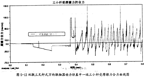 由圖5-11可以看出,雙取三叉桿式萬向聯(lián)軸器在動力仿真的過程中,其一端的三內(nèi)球頭同軸頸間的摩擦力變化相當(dāng)有規(guī)律。當(dāng)內(nèi)球頭相對軸頸運(yùn)動反向時(shí),它們就會在正負(fù)間有規(guī)律的切換。但在這里產(chǎn)生摩擦力的平均大小要較小桿上的小得多。