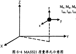 此單元為一個(gè)有六自由度的質(zhì)量單元。此單元的第一個(gè)不同的坐標(biāo)方向上可以施加不同的質(zhì)量大小和轉(zhuǎn)動(dòng)慣量。質(zhì)量單元是由單個(gè)節(jié)點(diǎn)、單元坐標(biāo)方向的集中質(zhì)量系數(shù)、單元坐標(biāo)軸的旋轉(zhuǎn)慣性所決定的。為了在加入質(zhì)量單元后不影響系統(tǒng)的慣性屬性,在此單元的實(shí)常數(shù)設(shè)定中慣性量應(yīng)設(shè)定的非常。ㄈ缧∮10-4)。單元如圖6-4所示。