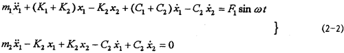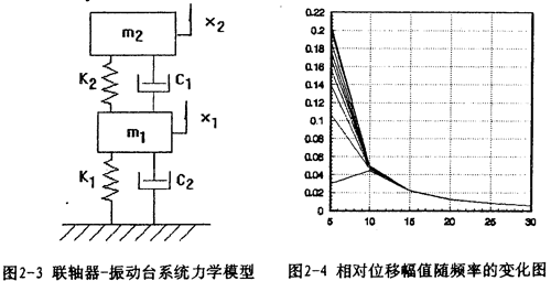 對應(yīng)的力學(xué)模型如圖2-3(見22頁)所示,式中m1為振動(dòng)臺(tái)動(dòng)圈、聯(lián)軸器外套及固定在振動(dòng)臺(tái)上夾具的質(zhì)量;m2為聯(lián)軸器內(nèi)套、芯軸及配重的質(zhì)量;K1為振動(dòng)臺(tái)支撐動(dòng)圈部分的剛度系數(shù),K2為聯(lián)軸器彈性元件的剛度系數(shù);C1為振動(dòng)臺(tái)動(dòng)圈阻尼系數(shù);C2為聯(lián)軸器