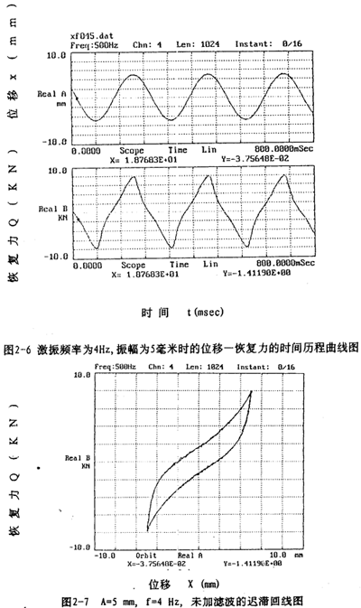信號處理時(shí),將磁帶記錄儀記錄的五路振動(dòng)信號經(jīng)磁帶記錄儀回放,輸出到數(shù)據(jù)采集板(A/D板)進(jìn)行五路振動(dòng)信號(恢復(fù)力、位移、速度、加速度信號)同步采樣和A/D轉(zhuǎn)換,然后輸出到PC386微機(jī)存人磁盤,該數(shù)據(jù)采集系統(tǒng)采集的數(shù)據(jù)都是以二進(jìn)制形式存儲(chǔ)的文件。為了計(jì)算和閱讀方便,需將二進(jìn)制數(shù)據(jù)文件轉(zhuǎn)換成ASC碼文件,然后再編程進(jìn)行數(shù)據(jù)處理.對處理后形成的數(shù)據(jù)文件進(jìn)行作圖可以形成許多相應(yīng)的曲線圖,圖2-6至圖2-13是眾多曲線中的一部分。