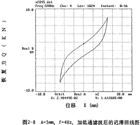 圖2-6表示激振頻率為4Hz,振動(dòng)位移幅值為±5毫米的位移和恢復(fù)力的時(shí)間歷程曲線圖,由圖可知,位移時(shí)間歷程為正弦波形,對應(yīng)的恢復(fù)力時(shí)間歷程為近似的鋸齒波形。以位移為橫坐標(biāo),恢復(fù)力為縱坐標(biāo),圖2-6對應(yīng)的位移恢復(fù)力圖為圖2-7,由此圖可知彈性聯(lián)軸器具有非線性遲滯特性。在動(dòng)態(tài)情況下,由于機(jī)座的高頻振動(dòng)和環(huán)境干擾等因素,試驗(yàn)記錄的信號中有高頻成分存在,這使得遲滯回線不光滑,加低通數(shù)字濾波后可得光滑的遲滯回線,如圖2-8所示。