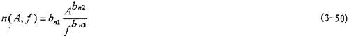 對于(3-22)模型,我們用阻尼耗能的能量關(guān)系來辨識阻尼力與振幅和頻率的關(guān)系。在前面,遲滯回線面積(即阻尼耗能)與振幅的函數(shù)關(guān)系已建立起來,見(3-38)式,而且式中參數(shù)也已辨識出。同樣,用數(shù)值積分,可以算出振幅一定,頻率變化時遲滯回線的面積,由此得出遲滯回線面積與頻率的對應(yīng)關(guān)系,將這些對應(yīng)關(guān)系畫成曲線如圖3-6中大圓點曲線所示。由遲滯回線面積隨頻率變化的規(guī)律分析,可建立其函數(shù)關(guān)系為: