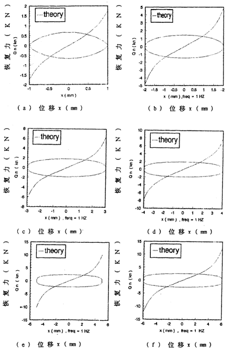 由數(shù)學模型(3-47) 計算可以得到不同激勵頻率和振幅下聯(lián)軸器恢復力遲滯回線數(shù)據(jù),為了證實(3-47)的正確性,下面畫出頻率為1赫茲、振幅為1~8毫米各工況下數(shù)學模型計算的理論數(shù)據(jù)和試驗數(shù)據(jù)表示的遲滯回線圖,如圖(3-8)(a)~(h)(見51~52頁)所示,圖中虛線為理論回線,實線為試驗遲滯回線。從圖中可知,理論遲滯回線十分接近試驗遲滯回線,由此可以說明建立的聯(lián)軸器數(shù)學模型(3-47)式可較好地描述恢復力隨振幅A頻率f、瞬時位移x和速度