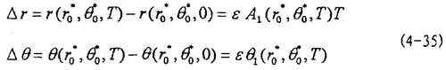 這就是對應(yīng)于(4-2)式的頻閃差分方程,即(4-2)式在Poicare平面上以T為周期的點變換方程。如ε充分小,則可令△τ=dτ,△r=dr,△θ=dθ,此外,(4-36)中的