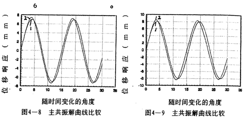 =2時(shí)兩者的重合性很好。(2).隨著振幅的增大,解析解曲線1和仿真解曲線2在相位上產(chǎn)生微小變化,解析解的相位超前仿真一個(gè)小量,原因是隨著振幅的增大,系統(tǒng)呈現(xiàn)更為強(qiáng)烈的非線性,而在推導(dǎo)中略去了高次項(xiàng),但還是可以滿足工程的要求。(3)從(4-78)-(4-85)式中的各δ值可知,在聯(lián)軸器產(chǎn)生主共振的情況下,激振力很小。