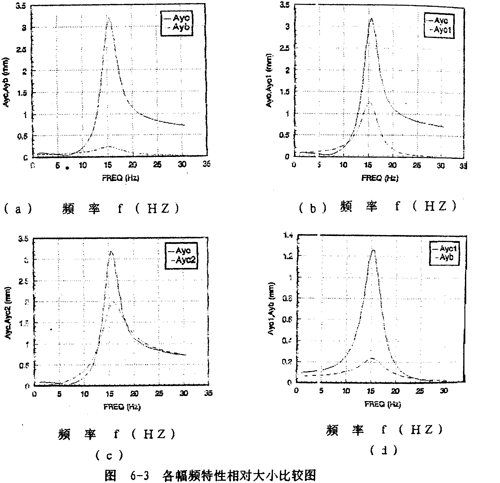yc2的幅頻特性如圖6-2(d)所示。Ayc2從1赫茲開始隨頻率的增大而迅速增大,在軸系的二階固有頻率15.56赫茲處達(dá)到最大值,然后隨頻率增大而減小并趨于某一定值,Ayc2隨頻率變化的規(guī)律反映圓盤僅在質(zhì)量偏心激勵下,而軸系沒有鋼絲繩聯(lián)軸器影響時圓盤的幅頻特性?紤]上聯(lián)軸器對圓盤幅頻特性的影響部分Ayc1(圖6-2(c)所示部分),則圓盤的幅頻特性即為圖6-2(a)所示。由此可見,鋼絲繩聯(lián)軸器在頻率的較低段(0~11赫茲)對圓盤振動有抑制作用。值得一提的是Ayc不是Ayc1和Ayc2的簡單相加,而與各頻率對應(yīng)的向量{a}中17個元素以及相位有關(guān)。