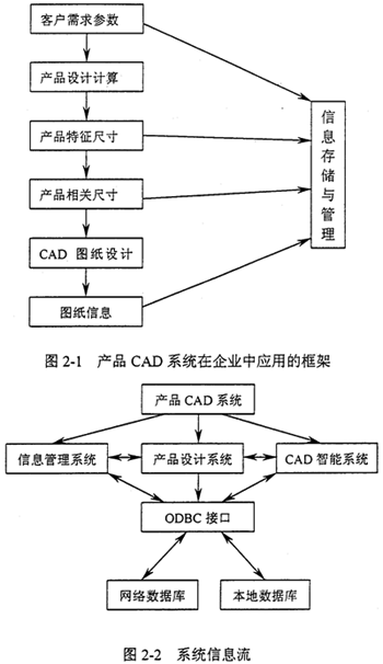 從企業(yè)的角度來說,利用計算機(jī)技術(shù),將企業(yè)的產(chǎn)品設(shè)計流程與企業(yè)管理有效地結(jié)合起來(圖2-l),實(shí)現(xiàn)企業(yè)管理與產(chǎn)品設(shè)計一體化。從系統(tǒng)實(shí)現(xiàn)的角度來說,是將CAD系統(tǒng)、信息管理系統(tǒng)和工程數(shù)據(jù)庫在網(wǎng)絡(luò)上的結(jié)合,見圖2-2,產(chǎn)品CAD系統(tǒng)包括產(chǎn)品信息管理系統(tǒng)和CAD的二次開發(fā)系統(tǒng),特點(diǎn)突出: