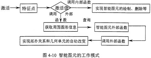通過對(duì)特征點(diǎn)的激活,首先判斷激活值,是調(diào)用外部函數(shù)還是調(diào)用內(nèi)部函數(shù),如果是調(diào)用內(nèi)部函數(shù),則根據(jù)激活值,調(diào)用某個(gè)內(nèi)部函數(shù),實(shí)現(xiàn)智能圖元自身的操作,如刪除、放大、旋轉(zhuǎn)等等;如果是調(diào)用外部函數(shù),則再獲取周圍圖元信息,并以此查詢外部函數(shù)庫,得到某個(gè)外部函數(shù),則調(diào)用此外部函數(shù),實(shí)現(xiàn)智能圖元的拓?fù)潢P(guān)系和幾何單元信息的改變。(如圖4-11所示)