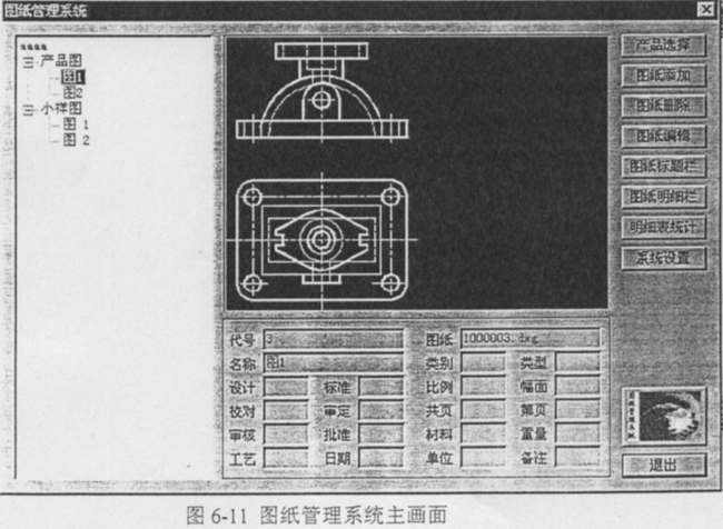 根據(jù)相應(yīng)項(xiàng)的密碼輸入,再選擇/添加/刪除產(chǎn)品,見圖6-10,進(jìn)行圖紙管理系統(tǒng)的主畫面(見圖6-11),進(jìn)而對(duì)產(chǎn)品選擇、圖紙進(jìn)行添加、刪除(圖6-12)及其編輯,明細(xì)表、標(biāo)題欄的設(shè)計(jì)(圖6-13)以及一些系統(tǒng)缺省值(圖6-14)的固定等等;