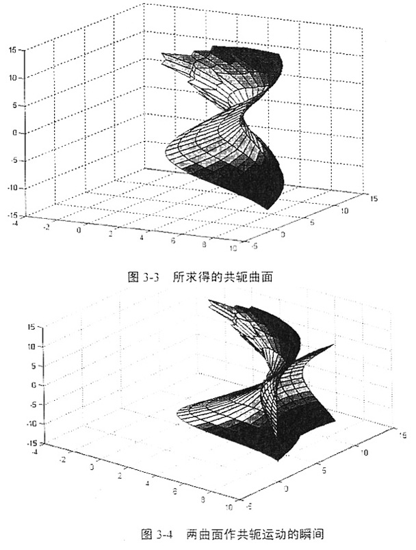 求出共軛曲面各節(jié)點(diǎn)坐標(biāo)值后,調(diào)用MATLAB繪圖命令就可以顯示共軛曲面的圖形,并通過編制的程序,還能夠以動畫的形式演示兩曲面作共軛運(yùn)動的過程。求得的共軛曲面及兩曲面作共軛運(yùn)動的瞬間分別如圖3-3、圖3-4所示: