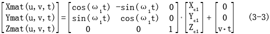 設(shè)已知接觸線為C1,它可以由三個一維數(shù)組Xc1,Yc1,Zc1表示,螺旋運(yùn)動的角速度為ω,軸向移動速度為v,則由它生成的螺旋面可以用如下的坐標(biāo)變換表示為: