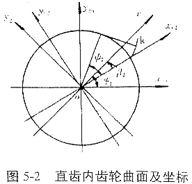 內(nèi)齒輪輪齒為直齒,其端面齒形及坐標關系如圖5-2所示。設端面齒廓線為漸開線,xc2坐標通過漸開線在基圓上的起點,在(o,xc2,yc2,zc2)坐標下的齒面方程為
